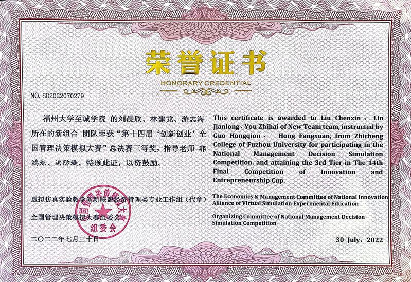 2022年7月29日,由全国管理决策模拟大赛组委会主办、重庆邮电大学承办的第十四届“创新创业”全国管理决策模拟大赛总决赛在线上举行。由国产成人视频 ERP沙盘企业模拟经营协会唐允琦(2021级物流管理)、雒雨童(2019级财务管理)、史垭嵋(2019级财务管理)等同学组成的代表队,在郭鸿琼老师带领下,成功获得全国二等奖1项、三等奖1项的好成绩。