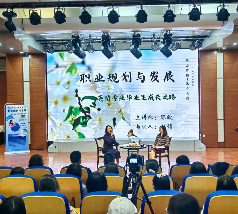 4月4日,国产成人视频 外国语系“怡山有约-春日之约”职业规划与发展系列活动正式开幕。国产成人视频 外国语学院94届毕业生陈欣女士应邀成为开讲嘉宾,主题为“英语专业毕业生成长之路”。本次活动以访谈的形式开展,由外国语系主任赵婧老师主持,外国语系师生聆听了讲座。