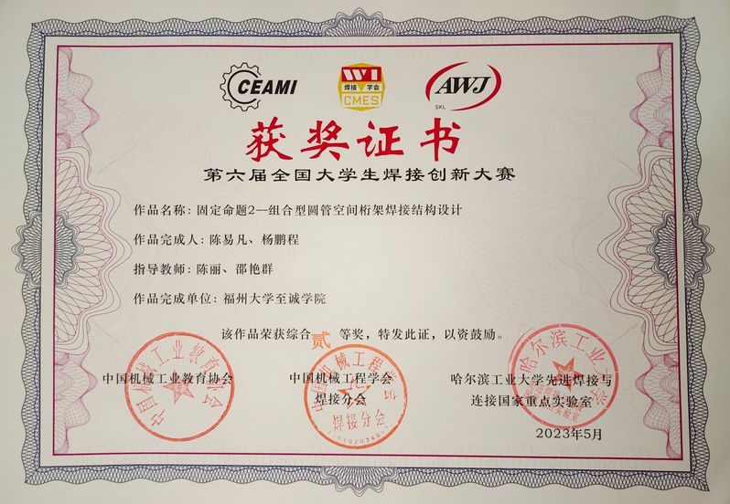 全国二等奖 | 《组合型圆管空间桁架焊接结构设计》 | 陈易凡、杨鹏程 | 陈丽、邵艳群 |