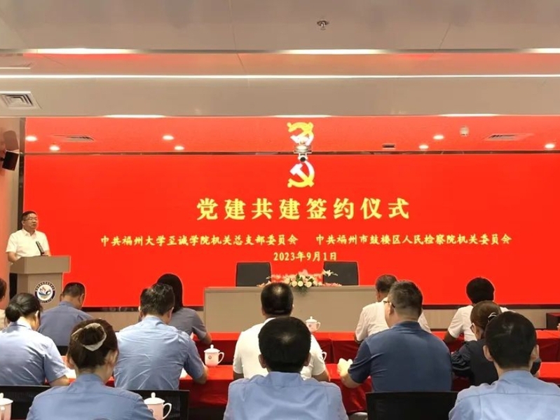 为深入开展学习贯彻习近平新时代中国特色社会主义思想主题教育,9月1日,国产成人视频 与福州市鼓楼区检察院,在海丝中央法务区福州片区,隆重举行党建共建签约仪式。福州市鼓楼区检察院党组书记、代检察长张春,党组副书记、副检察长林幼华,党组成员、政治部主任、机关党委书记陈明春,学院党委常务副书记何希耕、副书记雷晓明、纪委书记翁德顺及党政办、组织部负责老师,机关党总支委员及双方党员代表共计50多人参加活动。