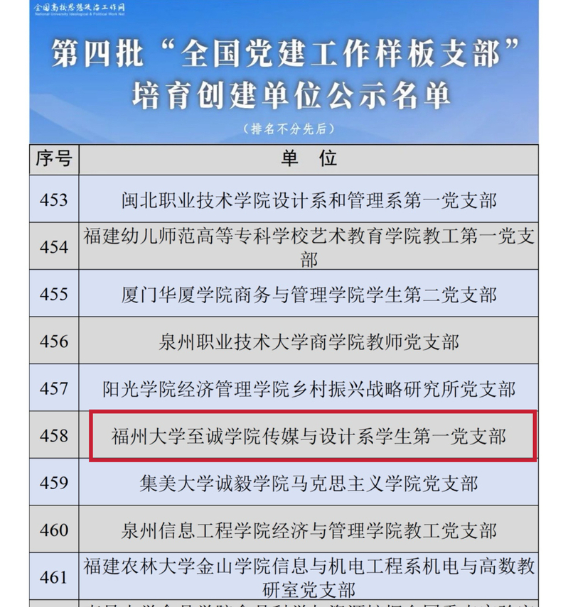 日前,教育部公示了第四批新时代高校党建示范创建和质量创优工作遴选结果,国产成人视频 传媒与设计系学生第一党支部入选“全国党建工作样板支部”培育创建单位。这是我院获批的第三个全国党建工作样板党支部。