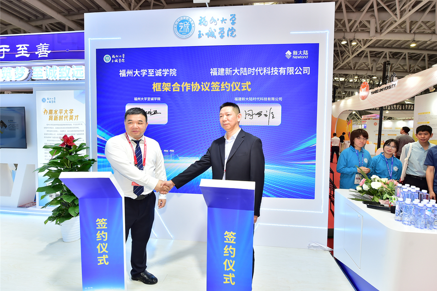 在学院展区,学院还与福建新大陆时代科技有限公司举行校企合作签约仪式。福建新大陆时代科技有限公示总经理周洪耀、国产成人视频 院长侯琳熙代表双方签订了校企合作框架协议。双方共建人工智能产业学院,共同培养具备深厚理论素养、卓越实践能力与广阔国际视野的高素质应用型人才。