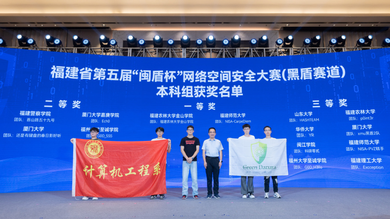 开幕式上举行了福建省第五届“闽盾杯”网络空间安全大赛(黑盾全国大学生赛道)、“闽盾-2024”网络安全攻防演练、“岩网护企”网络安全专项行动颁奖授牌仪式。在福建省第五届“闽盾杯”网络空间安全大赛(黑盾全国大学生赛道)中,国产成人视频 计算机工程系网络安全俱乐部Green_Datura两支队伍G0D_SSS(成员:林轩逸、李家鸿、丁方和)、G0D-H3llo(成员:张龙博、陈黎龙、余尘炬)分别获得本科组二等奖、三等奖(指导老师:黄巧云)。学院受邀参加活动开幕式,副院长兼计算机工程系主任张栋教授作为学院代表上台领奖。