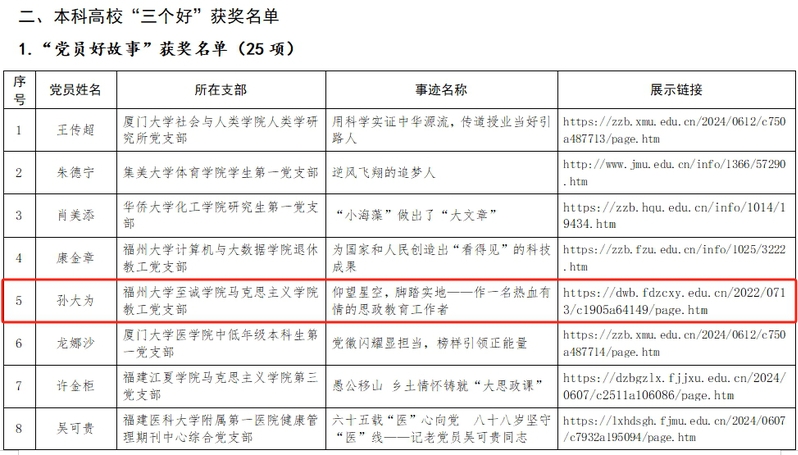日前,中共福建省委教育工委发布2022-2024学年高校党支部工作“立项活动”优秀成果和“党员好故事、书记好党课、支部好案例”获奖名单。国产成人视频 荣获2022-2024学年党支部工作“立项活动”优秀成果一等奖1项、三等奖1项,1名教师党员先进事迹入选“党员好故事”,取得学院在该项评选中的历年最好成绩。