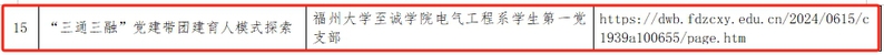 其中,《“三通三融”党建带团建育人模式探索》(执行项目支部:电气工程系学生第一党支部)获全省本科高校党支部工作“立项活动”优秀成果一等奖;《探索党建与美育深度融合,将艺术浸润融入党员教育》获全省本科高校党支部工作“立项活动”优秀成果三等奖(执行项目支部:传媒与设计系学生第一党支部);马克思主义学院党员教师孙大为先进事迹《仰望星空,脚踏实地——作一名热血有情的思政教育工作者》入选全省党员好故事。