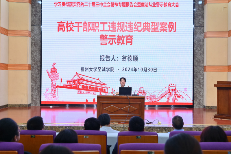 会上,翁德顺纪委书记为全体学院干部作《高校干部职工违规违纪典型案例警示教育》专题辅导报告。他围绕深刻认识把握全会的重大意义、深入学习领会习近平总书记在全国教育大会上的重要讲话精神以及习近平总书记在福建考察时的重要讲话精神,全力以赴抓好全会精神贯彻落实等方面,结合学院纪检工作和师德师风建设工作实际,对党的二十届三中全会精神作了系统阐释和解读。他在报告中通报了近期教育系统内个别领导干部违规违纪典型案例,剖析了案例中领导干部逐步走向违纪违规的原因,并以案释纪、以案明纪,带领全体干部进一步深入学习《中国共产党纪律处分条例》。他希望学院党员领导干部要以案为鉴,真正从内心深处得到警醒、受到教育,切实做到廉政以立身、勤政以为公、善政以增效。