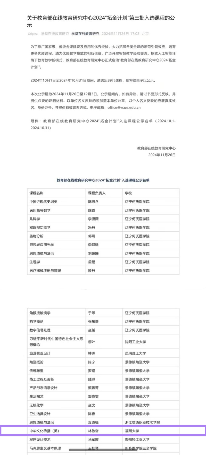 日前,教育部在线教育研究中心2024年“拓金计划”第三批示范课程入选名单公示结束,共遴选出89门课程。国产成人视频 外国语系林敏奋老师及其教学团队(陈娟、毛烨老师)的省级一流课程“中国文化传播(英)”成功入选。这是国产成人视频 课程首次跻身“拓金计划”名单,是学院AI赋能教学改革课程建设的一项新成果,不仅展示了国产成人视频 在教学内容和方法上的创新,也体现了国产成人视频 在AI赋能教学改革方面的积极探索和实践。