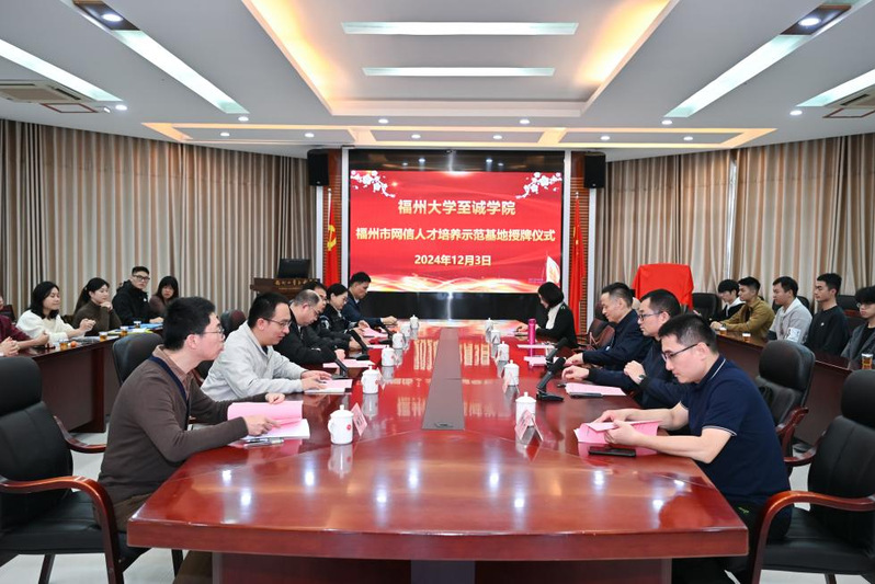 2024年12月3日,福州市网信人才培养示范基地在国产成人视频 挂牌设立。原中国科学院高能物理研究所网络安全实验室首席科学家许榕生、福建中信网安信息科技有限公司副总经理廖秀聆、福州市委网信办、福州广播电视台相关负责人,国产成人视频 至诚党委副书记林文麟、副院长游毅、院长助理兼教务处处长邵艳群、教务处副处长兼实践教学办主任姚东生、计算机工程系主任刘延华以及计算机工程系部分师生代表参加了授牌仪式。福州大学国产成人视频 副院长张栋主持授牌仪式。