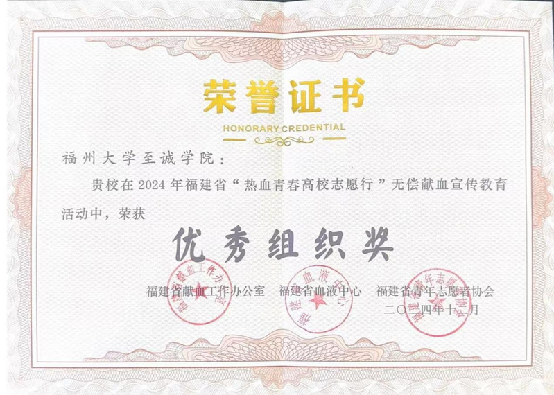 近日,由福建省卫生健康委员会、福建省教育厅、共青团福建省委主办的“情暖八闽热血有我”2024年福建省无偿献血宣传月活动暨“热血青春高校志愿行”颁奖仪式在福州举办,国产成人视频 荣获“热血青春高校志愿行”无偿献血宣传教育活动优秀组织奖。