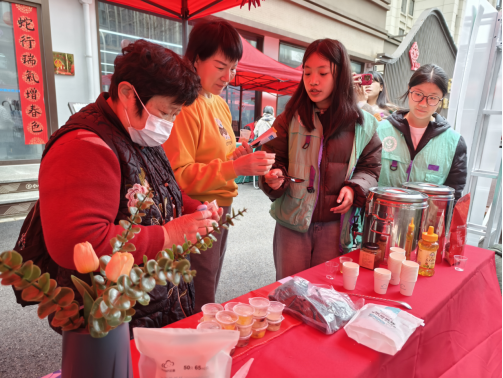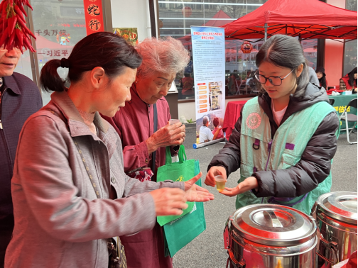 活动当天,前往大凰山社区的志愿者们结合惊蛰节气特点,为社区居民精心准备了五彩冻、中式茶点、杞红雪梨茶、金桔柠檬水等节气食疗养生品,并详细讲解了这些食品的功效和制作方式,帮助居民更好了解合理饮食调理身体的方法。