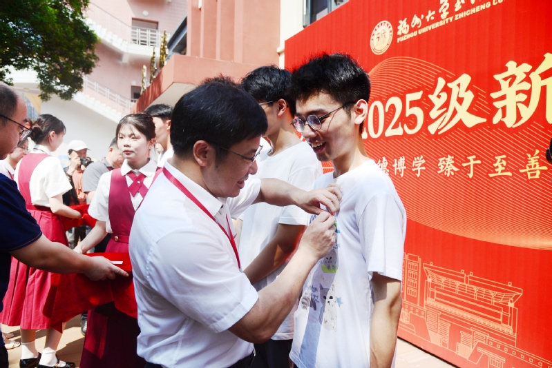 迎新现场,江莉龙副校长慰问新生及家长,向一线教职工和志愿者送上关怀,向当天生日的新生表达祝福,并为新生代表佩戴院徽。江莉龙副校长充分肯定了学院迎新工作呈现出的“高效有序、服务贴心”的良好风貌,并叮嘱要将人文关怀落实到每一个细节,让新生和家长满意、放心。