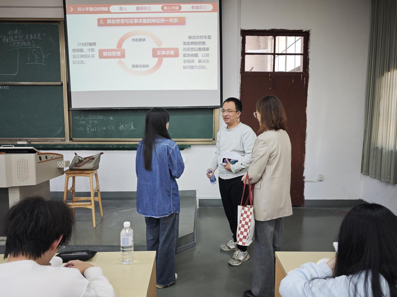 张栋副院长听取了马克思主义学院谢芳老师讲授的《毛泽东思想和中国特色社会主义理论体系概论》课程,课后与谢芳老师进行了面对面交流,对其严谨的教学逻辑和扎实的理论功底给予充分肯定。为进一步提升思政课教学质量、夯实育人根基,张栋副院长提出三点建议:一要精选案例,紧密联系时代与学生实际;二要创新方法,推动自主探究,促进价值认同;三要落脚于实效,实现能力与素养的同步提升。