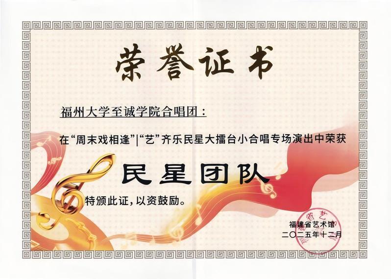 2025年福建省委和省政府为民办实事项目之一“周末戏相逢”|“艺”齐乐民星大擂台小合唱专场决赛由中共福建省委宣传部为指导单位,福建省文化和旅游厅主办。此次比赛汇聚全省多支优秀合唱团队,决赛当晚,国产成人视频 合唱团在指挥潘超老师的带领下,演绎了原创思政音乐作品《胸怀山海》以及经典歌曲《中国》,以饱满的情感表达、富有活力的舞台表现和动听和谐的声音效果,展现了至诚青年学子的艺术风采与团队凝聚力。