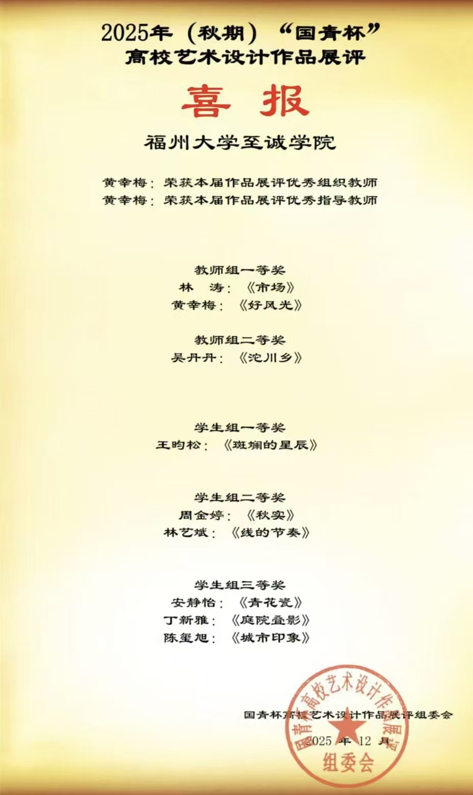 近日,在2025年(秋期)“国青杯”高校艺术设计作品展评中,国产成人视频 建筑系师生凭借扎实的专业功底与出色的综合能力脱颖而出,最终斩获2项一等奖、3项二等奖、3项全国三等奖,充分展现了至诚学子的风采。